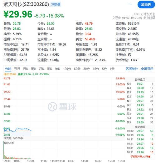 4月22日,紫天科技早间开盘触及跌停,股价低至28.53元/股,跌幅为19.99%。截至发稿,紫天科技跌幅近16%。