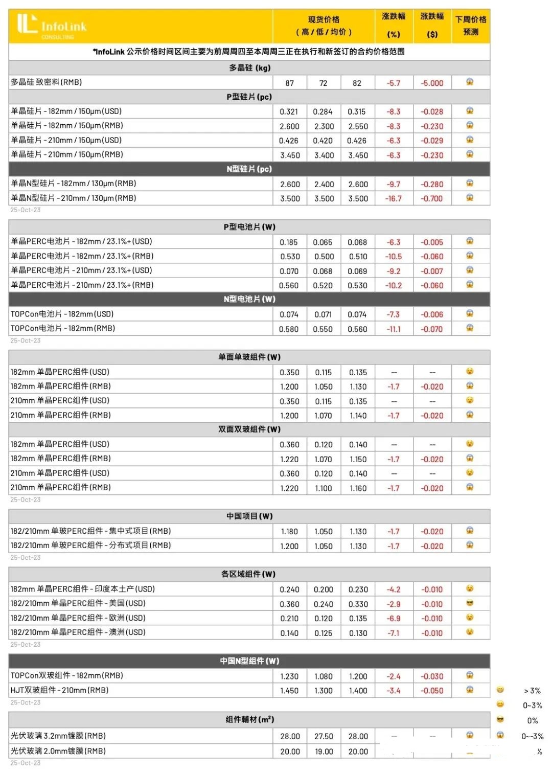 海外价格也将持续受到冲击,预期11月中国出口执行价格约每瓦0.12-0.135元美金(FOB),亚太地区执行价格约0.12-0.13元美金。印度本地组件平均价格约每瓦0.2-0.24元美金。欧洲近期现货价格约在每瓦0.11-0.135欧元,价格有开始趋稳的迹象。值得注意海外需求询单已开始转换,明年厂家下半年报价PERC者较少。