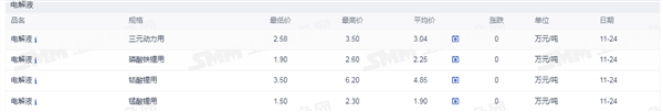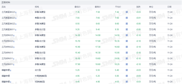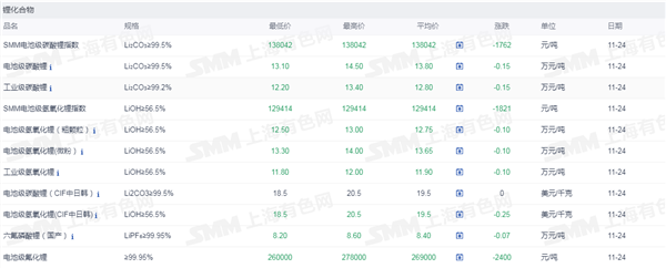 网络整理 2025-09-02 20:32证券之星新能源车行业周报:据上海有色网,截止11月24日,电池级碳酸锂13.1-14.5万元/吨,均价13.8万元/吨,环比上一工作日下滑0.15万元/吨;工业级碳酸锂12.2-13.4万元/吨,均价12.8万元/吨,环比上一工作日下滑0.15万元/吨。今日锂盐企业延续挺价出售散单的态度,依然以长单出货为主;而在近期碳酸锂现货价格连续下跌后,下游少部分正极材料企业采买情绪略微转变,个别正极材料企业在现货价格低位时期进行少量采买,但整体现货市场的散单成交量级仍较平淡,并未出现明显放量情况。