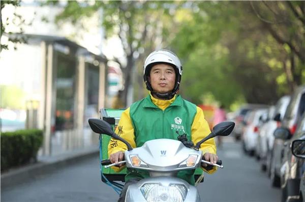 美团买菜驻站配送员李海刚在给附近居民区送菜途中 (资料照片)。新华社发