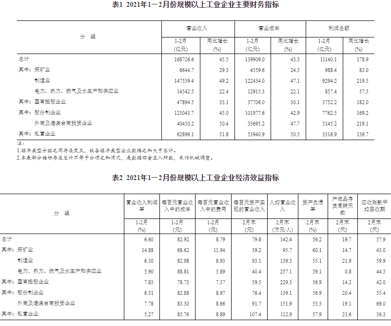 1—2月份,全国规模以上工业企业实现利润总额11140.1亿元,同比增长1.79倍(按可比口径计算,详见附注二),比2019年1—2月份增长72.1%,两年平均增长31.2%。