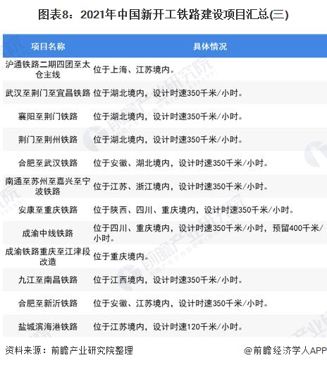 2020年开工渝昆高铁、渝湘高铁重庆至黔江段、郑济高铁濮阳至济南段、沪苏湖高铁、宜昌至郑万高铁联络线、成都至达州至万州高速铁路等多条高铁线。2021年全国又有68铁路项目计划开工,涉及全国多个省(市、区),具体项目如下: