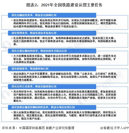 2021年全国将“变革”作为重点发展任务,努力释放铁路改革创新红利。要求深化运输组织变革,释放发达路网红利;深化管理变革,释放先进技术装备红利;深化机制变革,释放新体制红利;深化交通运输结构变革,释放铁路多式联运红利;深化经营方式变革,释放资源政策红利;运输主业上,要求深化铁路运输供给侧结构性改革,释放市场化经营红利。