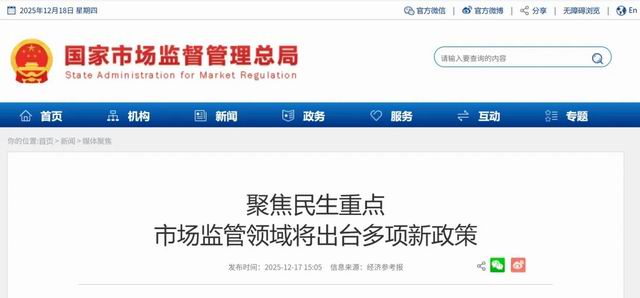 网络整理 2026-01-05 04:3612月16日,在市场监管总局四季度新闻发布会上,记者获悉,围绕规范平台经济、强化食品安全、加强反垄断反不正当竞争、加强和保障纤维制品质量安全监管等多个民生重点领域,市场监管总局将出台多项新的政策文件。