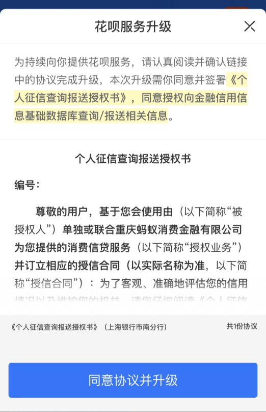 据悉,用户同意授权升级花呗服务后,其基本信息、花呗额度以及还款情况将会以月度为单位上报央行征信系统。