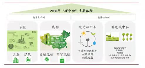 碳中和的减碳路径,对应着五大产业链:电力部门脱碳对应新能源产业链,工业部门减碳对应节能减排产业链,交通部门减碳对应新能源车产业链,建筑部门减碳对应着绿色建筑产业链,公共部门减碳对应着环保产业链。
