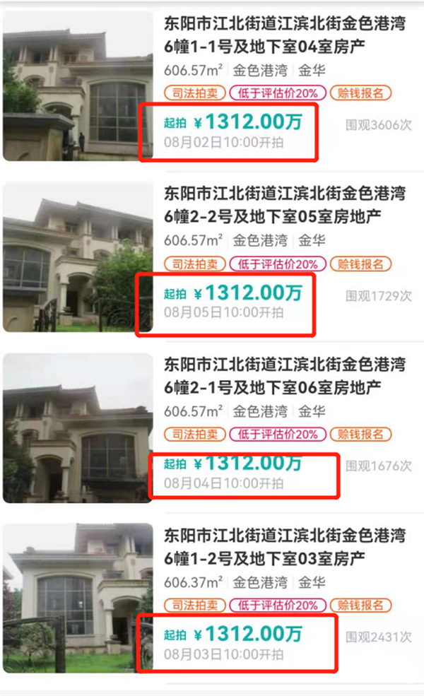 阿里拍卖信息显示,8月2日起至8月5日期间,浙江省金华市中级人民法院每天都将以1312万元的起拍价开拍一套别墅,合计四套,每套评估价约为1640万元。