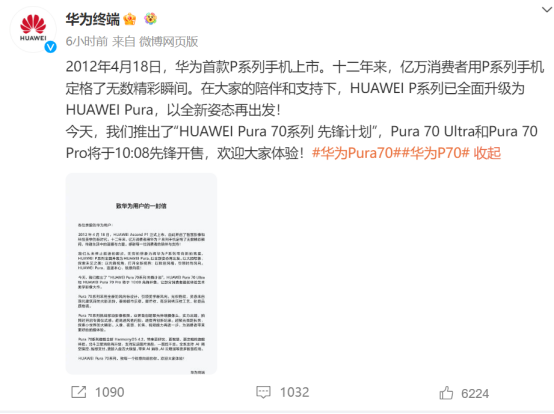 4月18日,华为终端官宣,4月18日10:08,华为Pura70 Ultra、华为Pura 70 Pro开启先锋计划,正式开售。4月22日10:07,华为Pura 70 Pro+、华为Pura 70将先锋开售。几款新品采用三角形风向标设计,价格5499元起。
