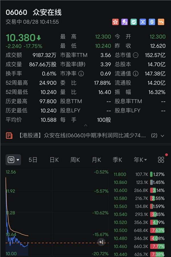 另外,众安在线跌幅更是超过17%。昨日,众安在线(06060)公布,截至2024年6月30日止六个月,母公司股东应占净利润5546.7万元(人民币,下同),同比减少74.96%,每股基本盈利0.04元。不派中期股息。