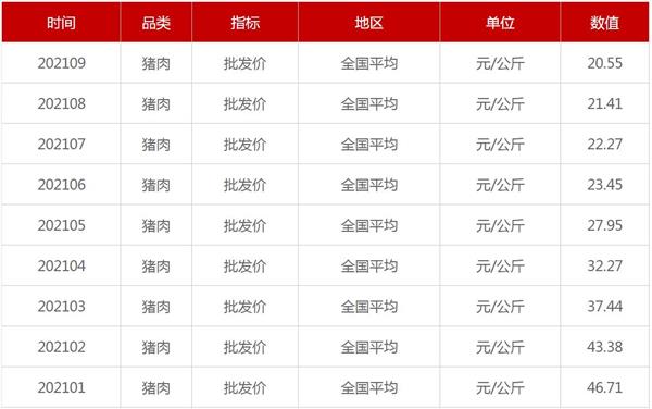 据农业农村部披露的农产品批发价格数据,全国平均猪肉批发价年内逐月走低,从1月份的46.71元/公斤,跌至9月份的20.54元/公斤,区间累计降幅达56%。