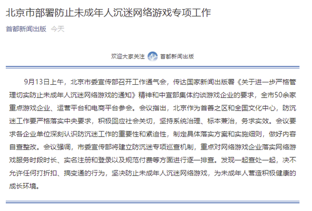 9月17日,北京市新闻出版局发布文称:9月13日上午,北京市委宣传部召开工作通气会,传达国家新闻出版署《关于进一步严格管理切实防止未成年人沉迷网络游戏的通知》精神和中宣部集体约谈游戏企业的要求,全市50余家重点游戏企业、运营平台和电商平台参会。