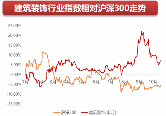 从板块整体走势来看,建筑板块经过五年的下探,今年终于跑赢大盘,2021年初至11月底申万建筑装饰指数上涨7.0%,跑赢沪深300指数约13.9个百分点。