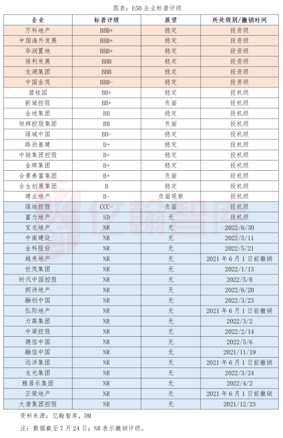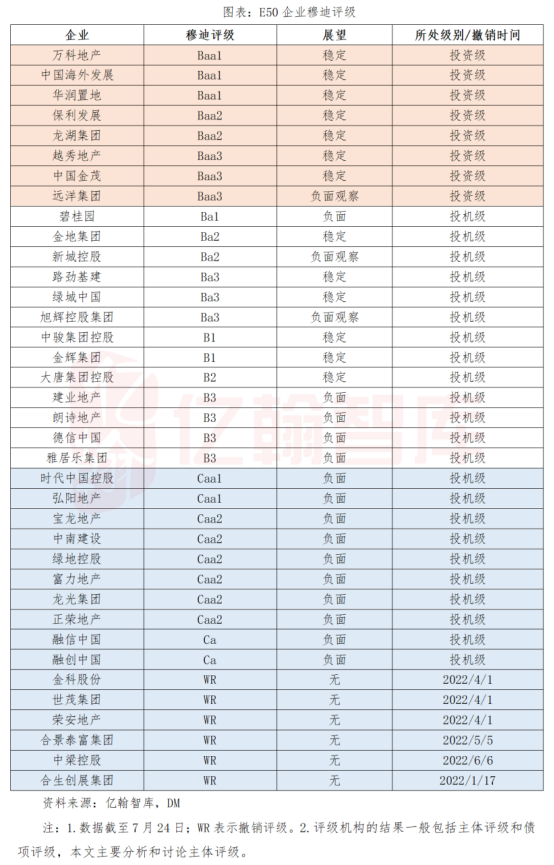 具体而言,E50企业中,穆迪21%企业为投资级,其中仅龙湖一家民企;惠誉35%为投资级,其中仅龙湖、碧桂园两家民企;标普16%企业为投资级,其中仅龙湖一家民企。