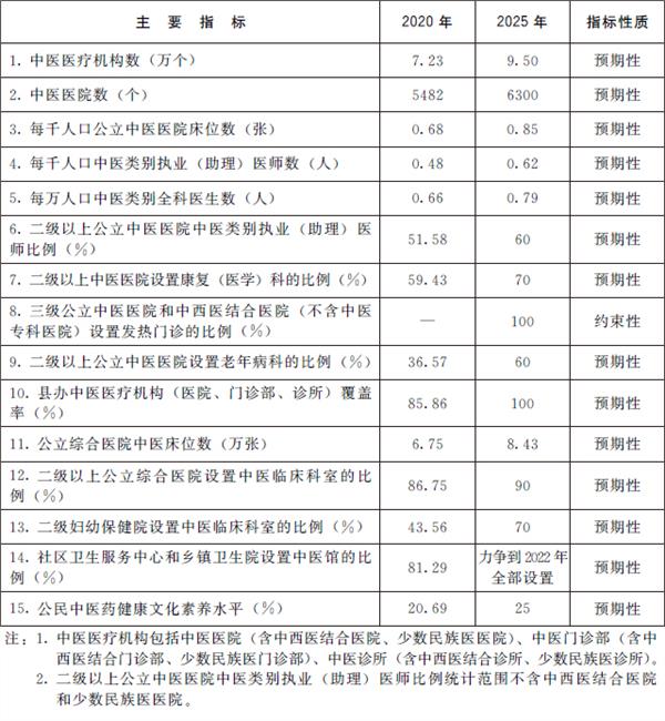 发展目标。到2025年,中医药健康服务能力明显增强,中医药高质量发展政策和体系进一步完善,中医药振兴发展取得积极成效,在健康中国建设中的独特优势得到充分发挥。