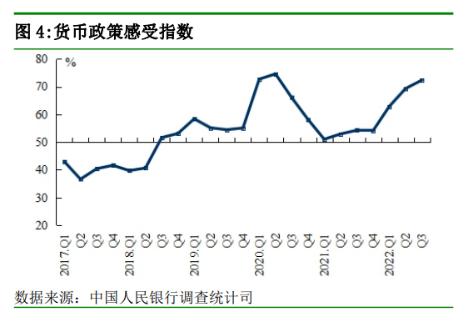 银行家对货币政策感受也有所提高。调查显示,三季度货币政策感受指数升至高位,为72.3%,比上季度上升3.0个百分点,比上年同期上升18.1个百分点。另外,银行家对四季度货币政策感受预期指数还高于本季度0.4个百分点。