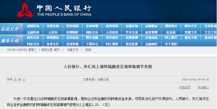 网络整理 2025-11-17 16:0810月25日,人民银行发布公告称,为进一步完善全口径跨境融资宏观审慎管理,增加企业和金融机构跨境资金来源,引导其优化资产负债结构,人民银行、外汇局决定将企业和金融机构的跨境融资宏观审慎调节参数从1上调至1.25。