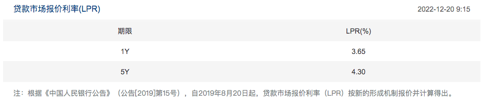12月20日,中国人民银行授权全国银行间同业拆借中心公布,2022年12月20日贷款市场报价利率(LPR)为:1年期LPR为3.65%,5年期以上LPR为4.3%。均较上月维持不变。
