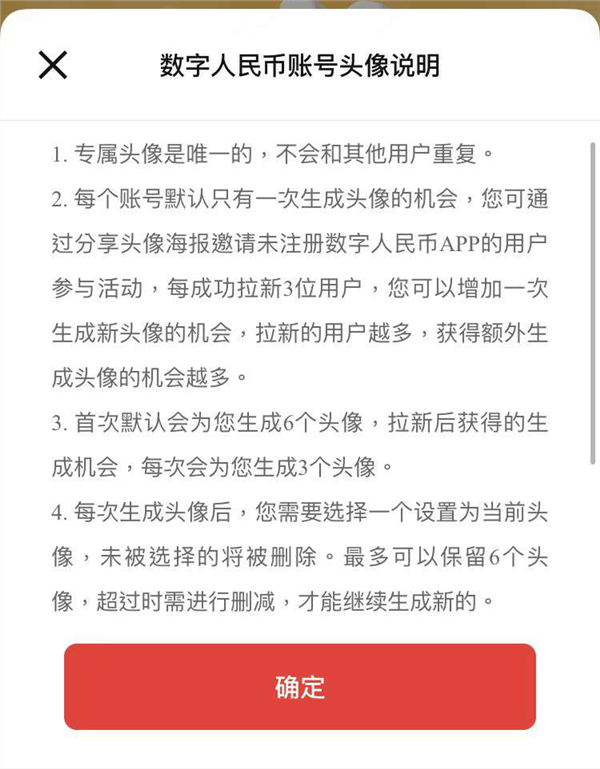 这一功能中还植入了数字人民币APP的推广策略。页面说明显示,每个专属头像都是唯一的,不会和其他用户重复,每个账户默认只有一次生成头像的机会,但用户可以通过“拉新活动”再次生成新头像,每成功拉来3位新用户注册,就可以增加一次生成新头像的机会。