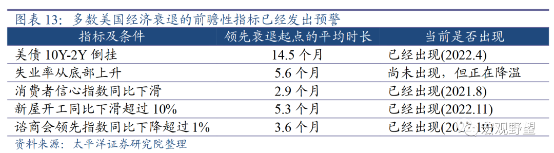 2023年美联储有没有可能开启降息周期?我们认为降息的条件是美国经济出现衰退。目前美联储整体态度仍然较为鹰派,其根源在于美国就业和消费韧性仍存,给了美联储更大的底气来治理通胀。但如果美国经济进入衰退,则通胀压力也至少会阶段性缓解,美联储有很高的概率会随之进入降息周期中。我们认为2023年美国进入衰退的概率较大。我们归纳了一些历史经验上对于指示美国经济衰退较为有效的前瞻性指标,以及相应指标发出预警信号的条件和领先经济衰退的平均时长,如下表所示。可以看到,美债收益率曲线倒挂、消费信心大幅下滑、房地产领域快速冷却、咨商会领先指标下滑等一系列指向衰退的信号都已出现,只有失业率数据还处于低位,这与美国疫情后始终较低的劳动参与率有关。综合来看,我们认为各项前瞻性指标预示2023年美国经济进入衰退的概率很大,衰退的时点可能在年中左右。所以我们认为美联储有很大概率会在年中或下半年进入降息周期。