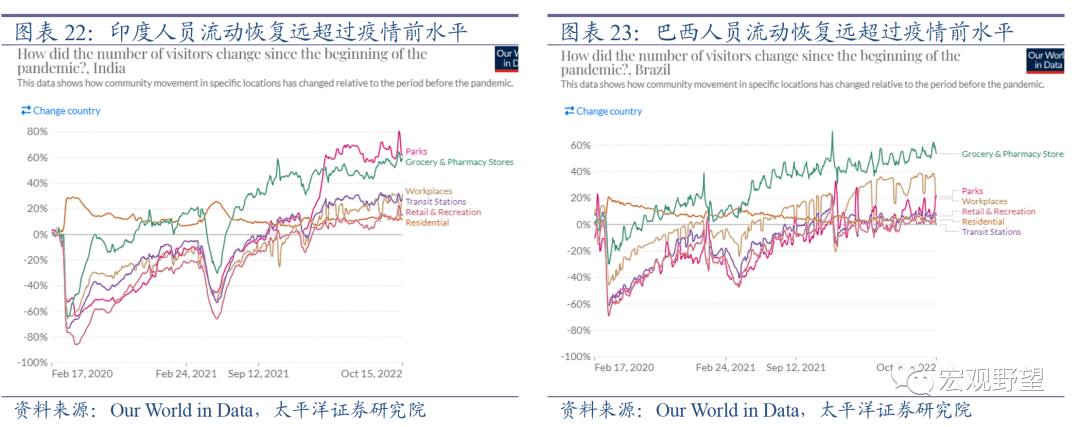 最后我们观察新兴市场和发展中国家的经验,新兴经济体的人员流动恢复的状况普遍非常好。有趣的是,大部分新兴市场国家的人员流动状况不仅恢复到了疫情前的水平,甚至还远超过疫情前的水平。这一情况并非少数国家的特例,而是众多新兴经济体的共性,也就意味着背后有着深层的经济或社会规律。人员流动状况恢复至疫情前的水平容易理解,但为什么会远超过疫情前的水平呢?我们认为这可能与相关国家外出工作的人数增多有关。疫情期间低收入群体的财务状况受到的冲击更大,这部分人群在疫情防控政策放开后有更强的动力外出工作来获取收入,所以人员流动率随之上升,而发展中国家的低收入群体远远多于发达国家,故而宏观上表现为发展中国家整体人员流动率恢复情况非常好。