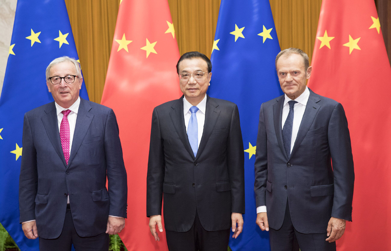 7月16日上午,国务院总理李克强在北京同欧洲理事会主席图斯克、欧盟委员会主席容克共同主持第二十次中国欧盟领导人会晤。