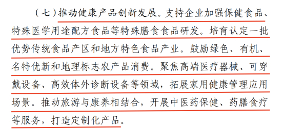 《方案》明确提出支持企业加强保健食品、特殊医学用途配方食品等特殊膳食食品研发。培育认定一批优势传统食品产区和地方特色食品产业。鼓励绿色、有机、名特优新和地理标志农产品消费。聚焦高端医疗器械、可穿戴设备、高效体外诊断设备等领域,拓展家用健康管理应用场景。推动旅游与康养相结合,开展中医药保健、药膳食疗等服务,打造定制化产品。